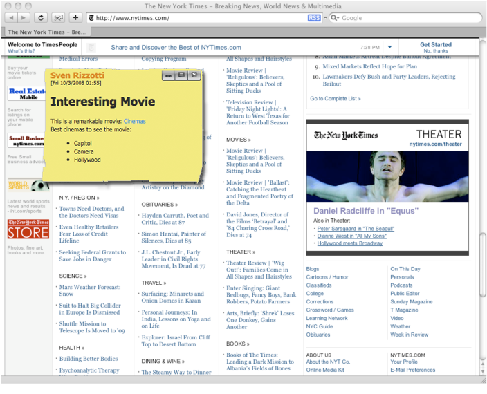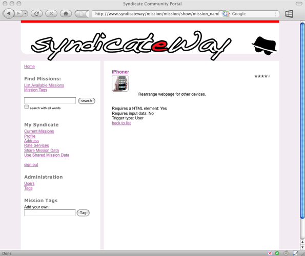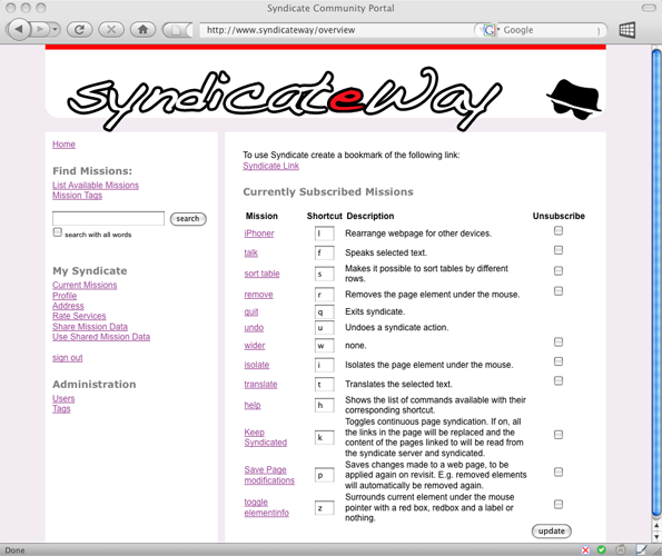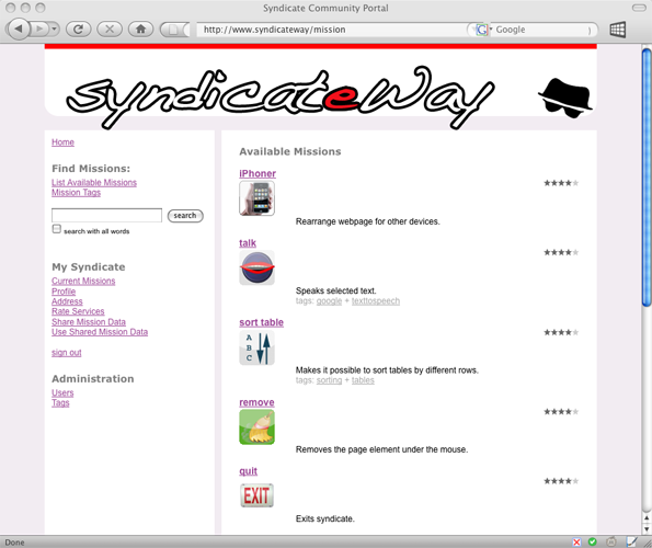 With Syndicate, every web page can be customized with a simple click on a stored bookmark. The presentation, the content or the data sources can be altered and remixed. In order to make use of these modification a social platform has been set up, where customization tasks can be found and subscribed to.